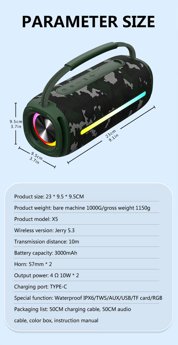 Bring the party anywhere with this powerful and portable TWS Wireless Bluetooth Speaker, designed for outdoor adventures, beach trips, camping, showers, and more. Featuring 20W stereo sound, dynamic RGB LED lighting, and IPX6 waterproof protection, it’s your go-to speaker for powerful sound and bold style — rain or shine.